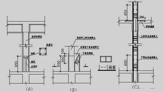 3 支承在懸臂板上的抗裂柱,與梁同標(biāo)高部位應(yīng)與梁同時(shí)安裝模板、鋼筋和澆筑混凝土,如圖3.6.1節(jié)點(diǎn)①、②所示。
