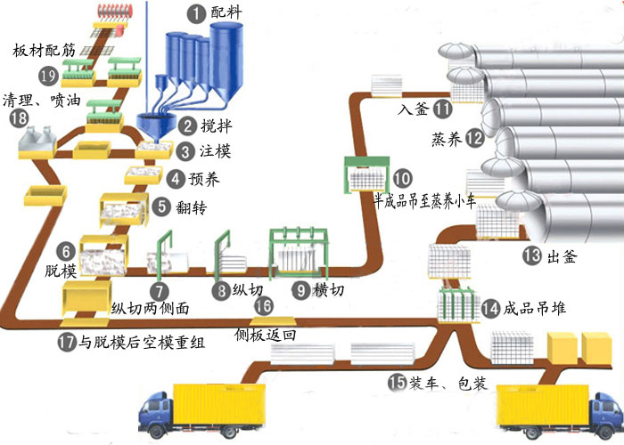 (1)原料貯備倉(cāng)→(2)計(jì)量配料→(3)原料加水混合攪拌→(4)模具準(zhǔn)備→(5)澆注→(6)發(fā)氣靜?!?/span>7)脫模→(8)翻轉(zhuǎn),水平切割、垂直切割→(9)編組入釜→(10)高溫高壓養(yǎng)護(hù)→(11)成品出釜→(12)檢驗(yàn)成品→(13)碼垛貯存→(14)出廠
