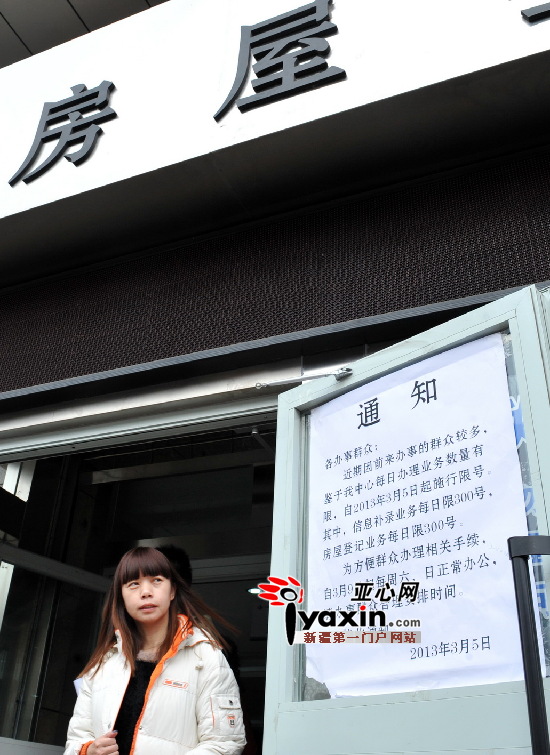 圖為 10日12時,烏魯木齊房產(chǎn)交易中心門前張貼著限號的通知,前來辦理業(yè)務(wù)的市民絡(luò)繹不絕。記者 李瑞 攝