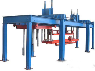 在加氣混凝土設備砌塊切割工藝中,翻轉(zhuǎn)吊具將模具凌空翻轉(zhuǎn)90度后脫模將坯體及側板一同至于切割臺上,啟動縱向切割裝置的行走電機對坯體進行側面切及 上、下水平分層階梯切割,在切割后行走至暫停位置,橫向切割裝置通過電機帶動行走至切割位后,啟動橫切架上、下垂直工作電機,橫切家自上而下,此時,擺動 電機啟動,并對坯體進行雙向交錯拉鋸式擺動,從而對批體進行上下垂直切割。在橫切架復位后(即切割完畢),橫向切割裝置繼續(xù)前行至暫停位。(待切割好的坯 體及側板經(jīng)半成品吊具吊至蒸養(yǎng)小車,進行編組入釜蒸養(yǎng)出成品。)橫向縱向切割裝置行至初始位置。以此類推,周而復始,從而實現(xiàn)對坯體的切割。 |